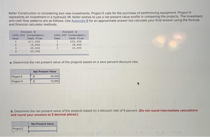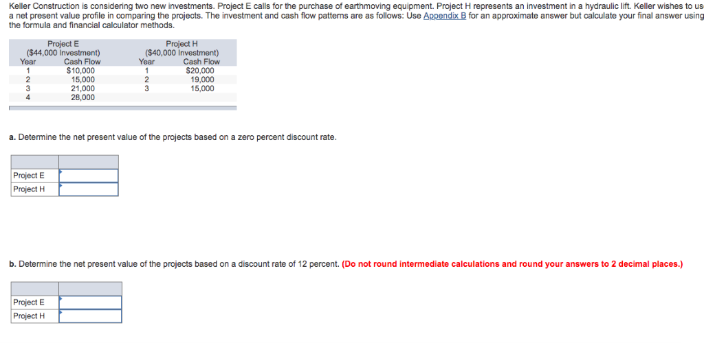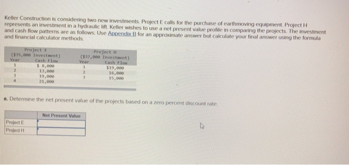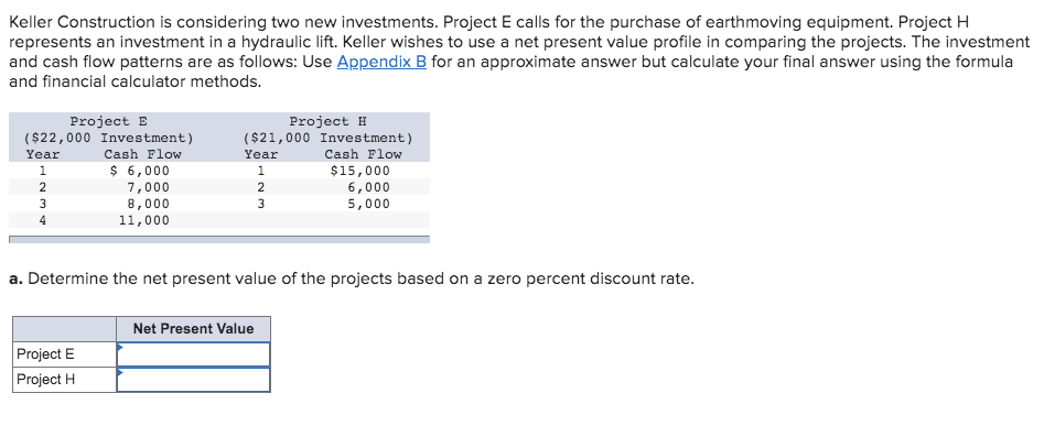Project H represents an investment in a hydraulic lift. Project E calls for the purchase of earthmoving equipment. Keller Construction is considering two new investments.